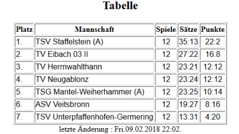 Herrnwahlthann 2 begann das Turnier in Gruppe B gegen Amendingen und gewann deutlich mit zwei Sätzen 11:4 und 11:5. Im zweiten Spiel gegen Segniz fanden wir durch einige Unsicherheiten bei der direkten Ballannahme nicht so richtig ins Spiel und mussten mit einem knappen Unentschieden zufrieden sein. Durch das diesmal bessere Ballverhältnis konnten wir uns trotzdem den ersten Platz in der Gruppe B sichern. Unser Plan, Stammbach in Gruppe B aus dem Weg zu gehen, ging in Erfüllung. Im Halbfinale war unser Gegner der Ausrichter Neugablonz. Dieses Spiel hatten wir von Anfang bis Schluss durch Kampf und guter Leistung im Griff. Am Ende standen wir mit 11:4 und 11:8 verdient im Finale. Unser Wunsch zur Süddeutschen Meisterschaft nach Bad Liebenzell zu fahren ist in Erfüllung gegangen. Wir konnten erleichtert ins Finale gegen Segnitz gehen.